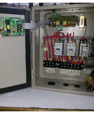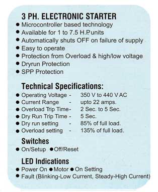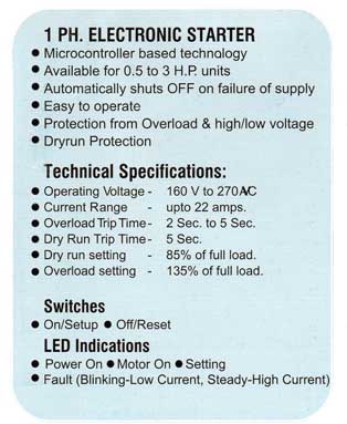 Presettable set point - Sump And Over haed tank Status,Pump Status,No load and over Load Protection,Push Button Switches for control Setting.